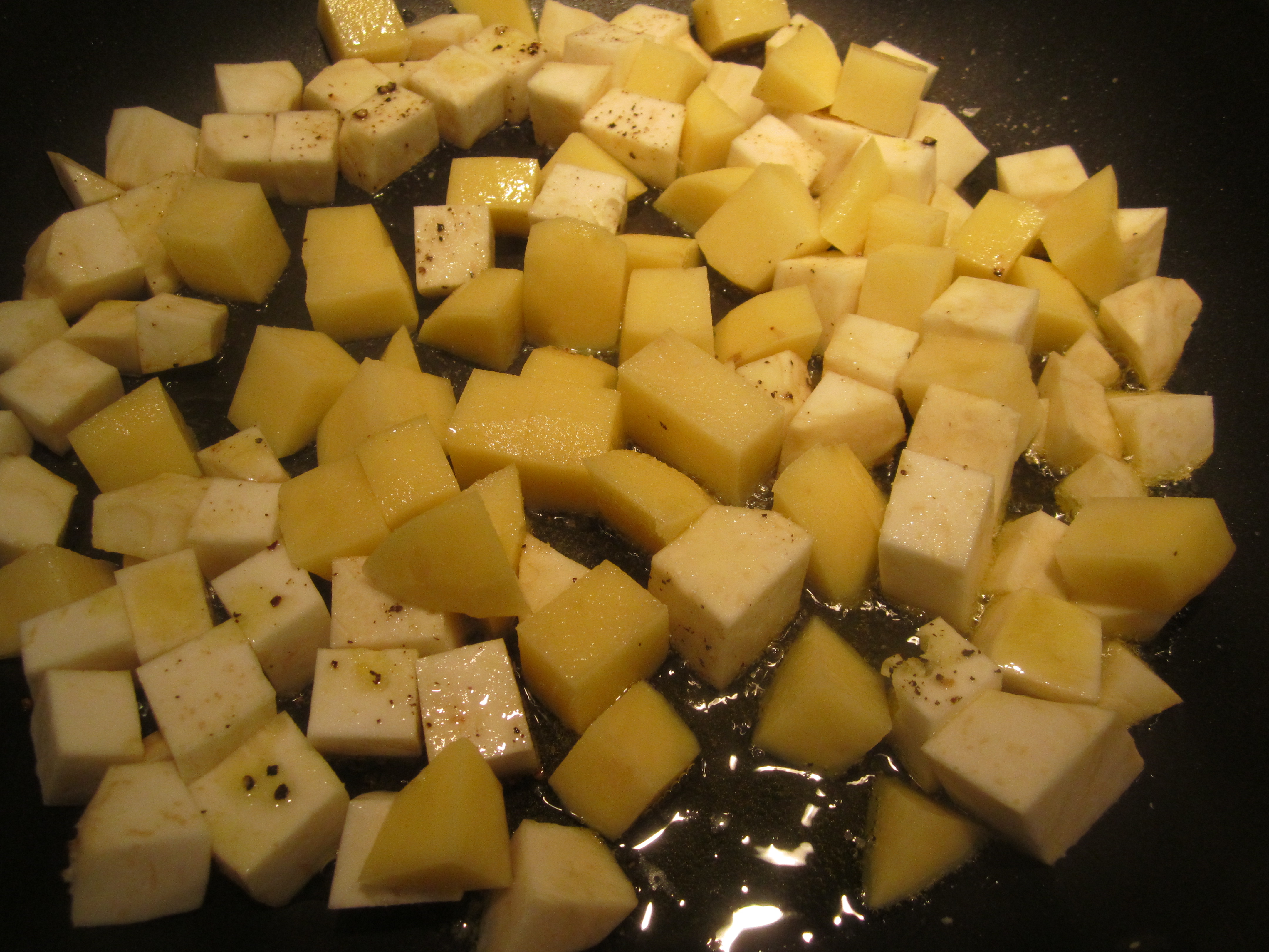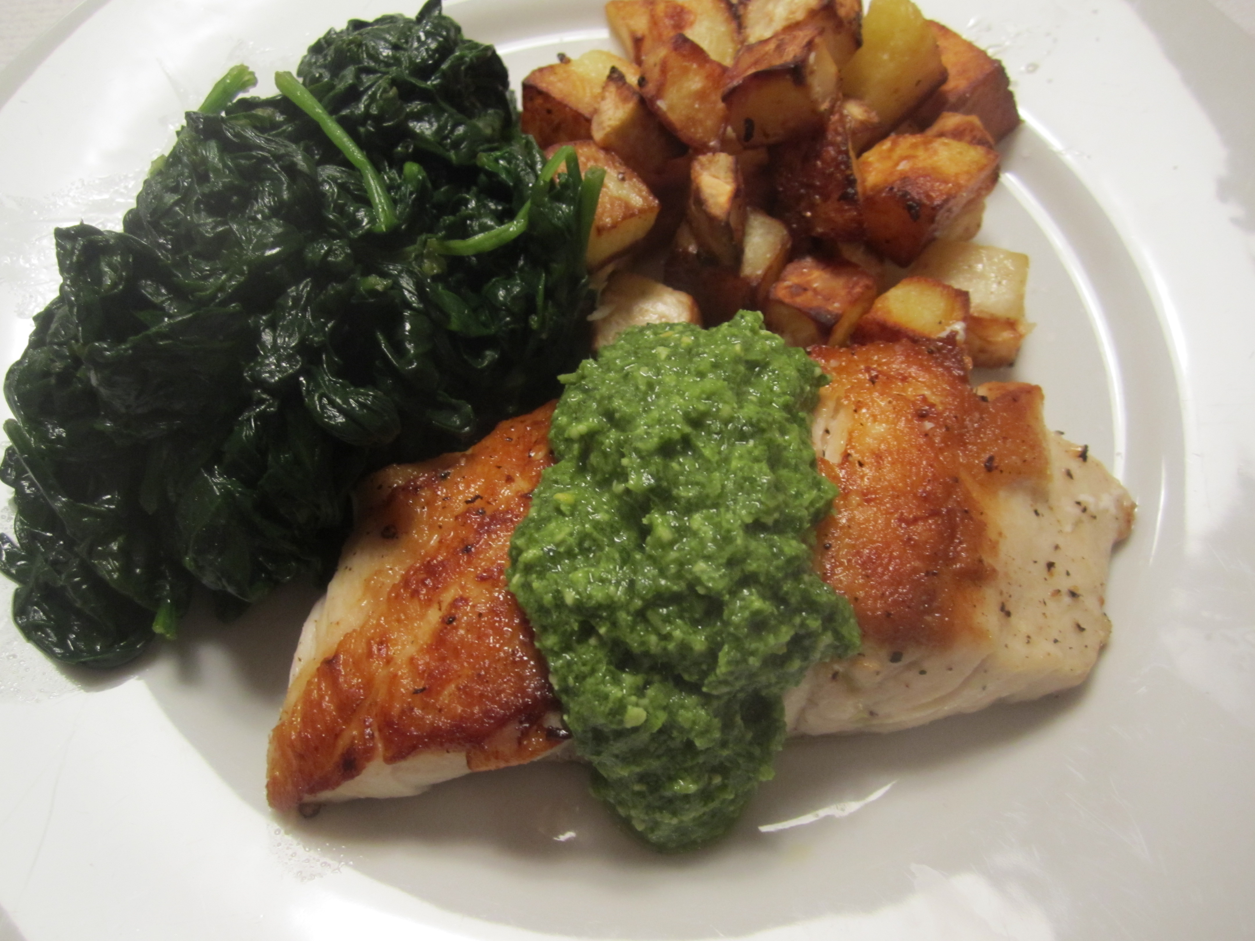 In addition to some sauteed spinach, I made some cubed, crispy pan-fried potatoes and celery root.