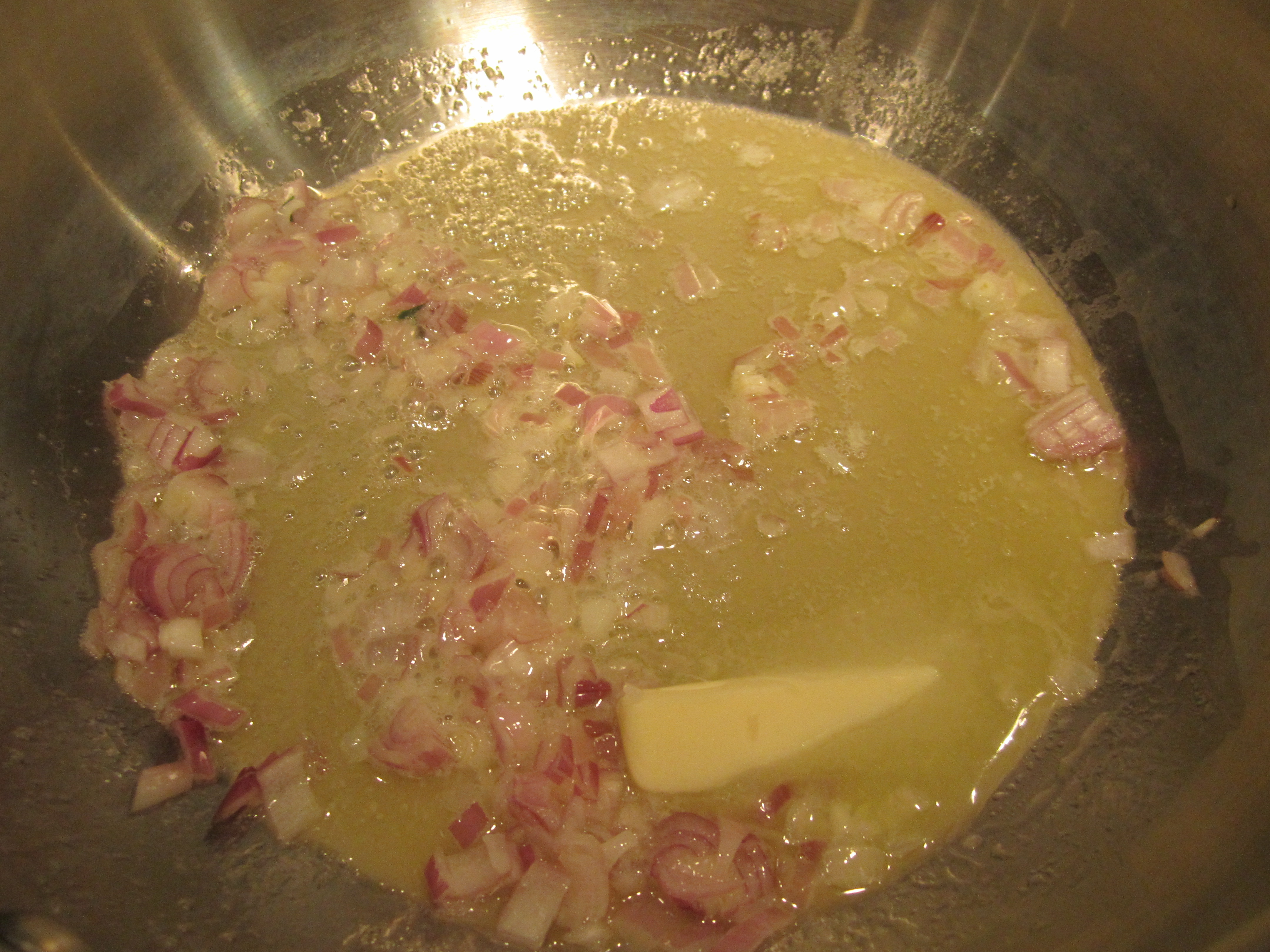 For tonight’s risotto, I’ve begun with two shallots and 3 tablespoons butter, sauteed on low heat until the shallots begin to wilt and caramelize.