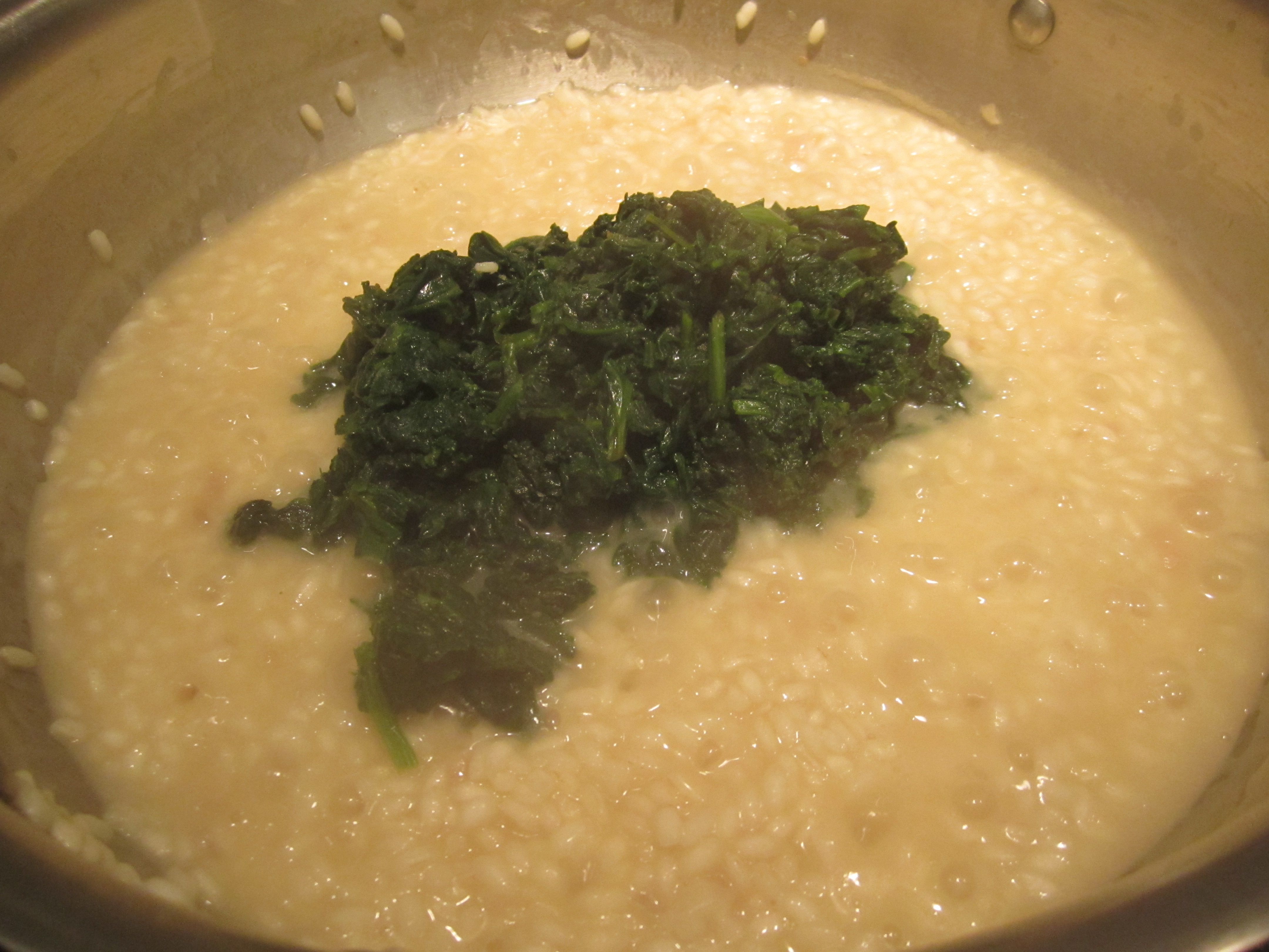 In addition to the pesto, I had some sauteed spinach left from the other evening’s meal. It had been sauteed in butter with a touch of nutmeg and would be delicious in a buttery risotto.
