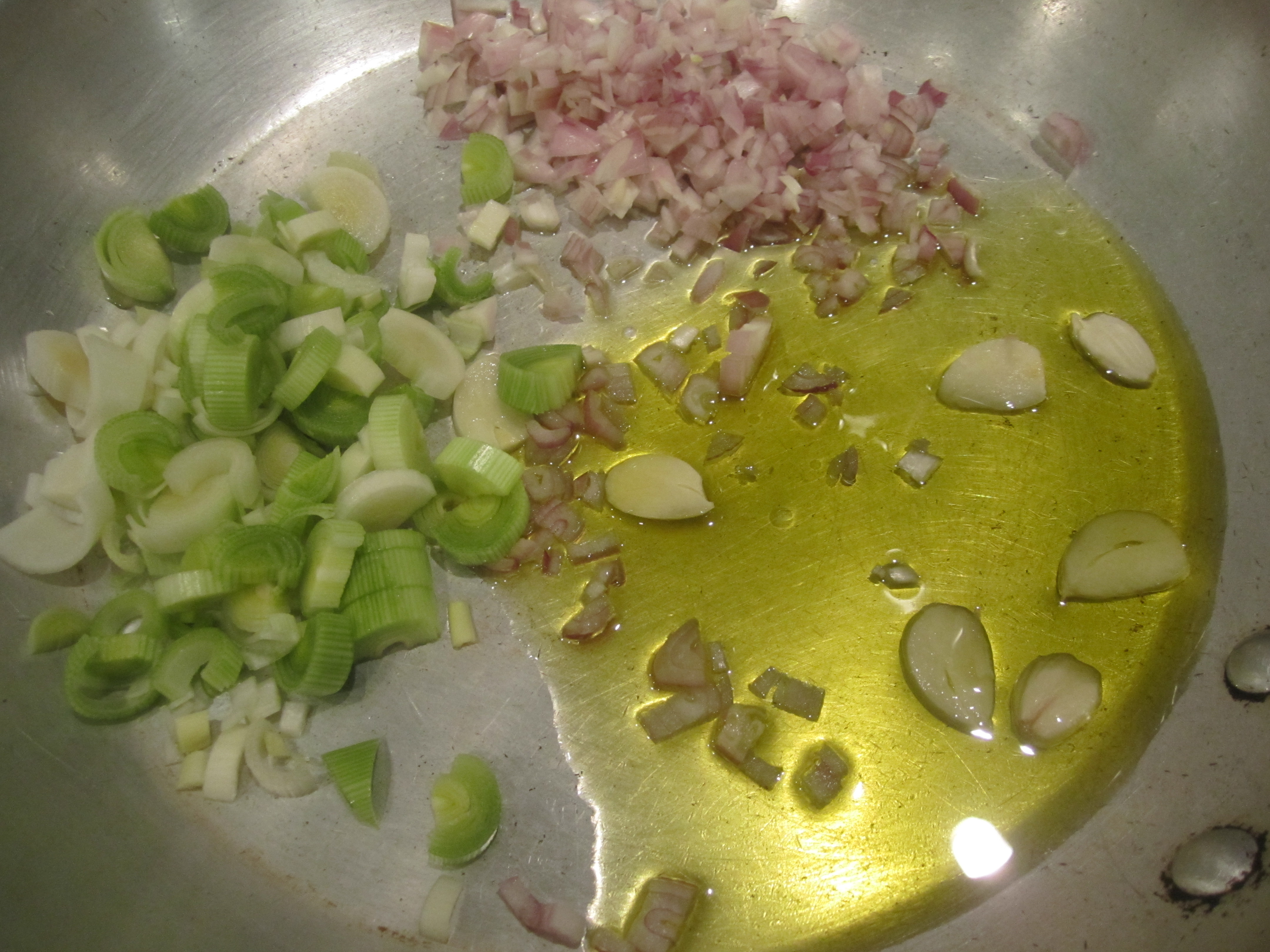While the pasta (I use dried linguine) cooks, in a large skillet over medium heat, add leeks, garlic, shallots and olive oil.