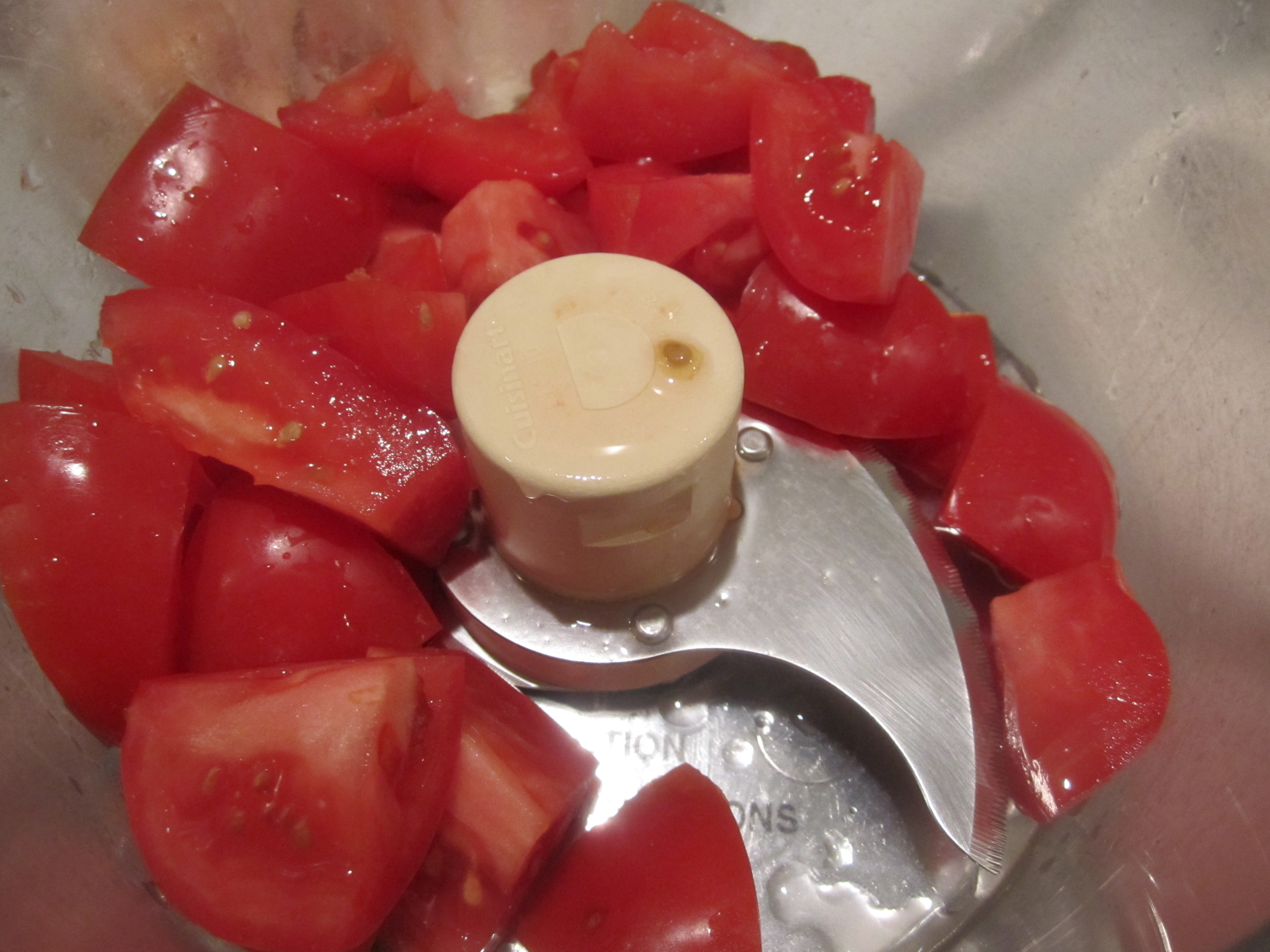 In a food processor, puree 2 ripe plum tomatoes, and set aside.