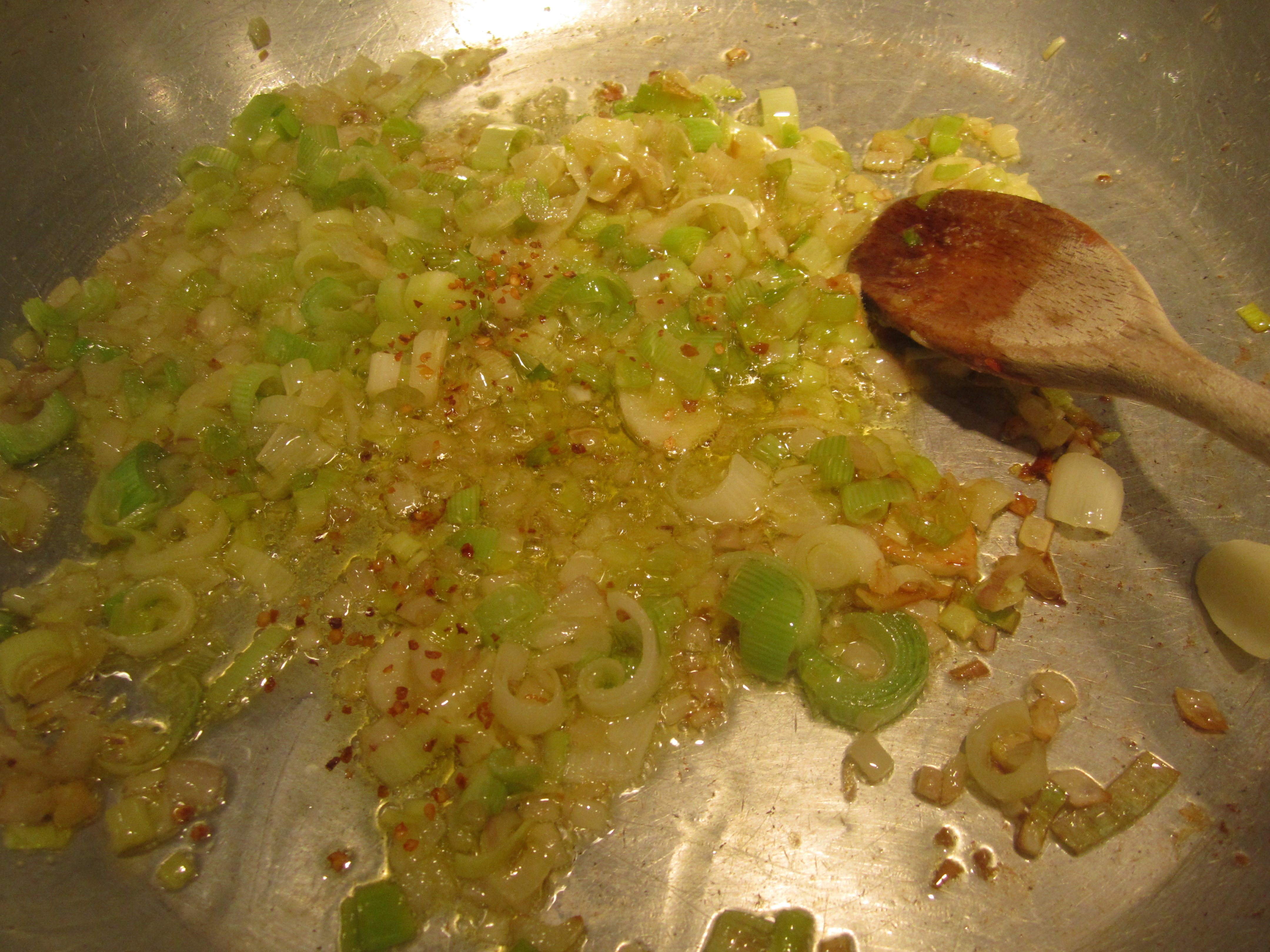Saute on low heat until they are softened, but not browned–about 8 minutes. Add chili flakes and continue sauteing on low heat for another 5 minutes.