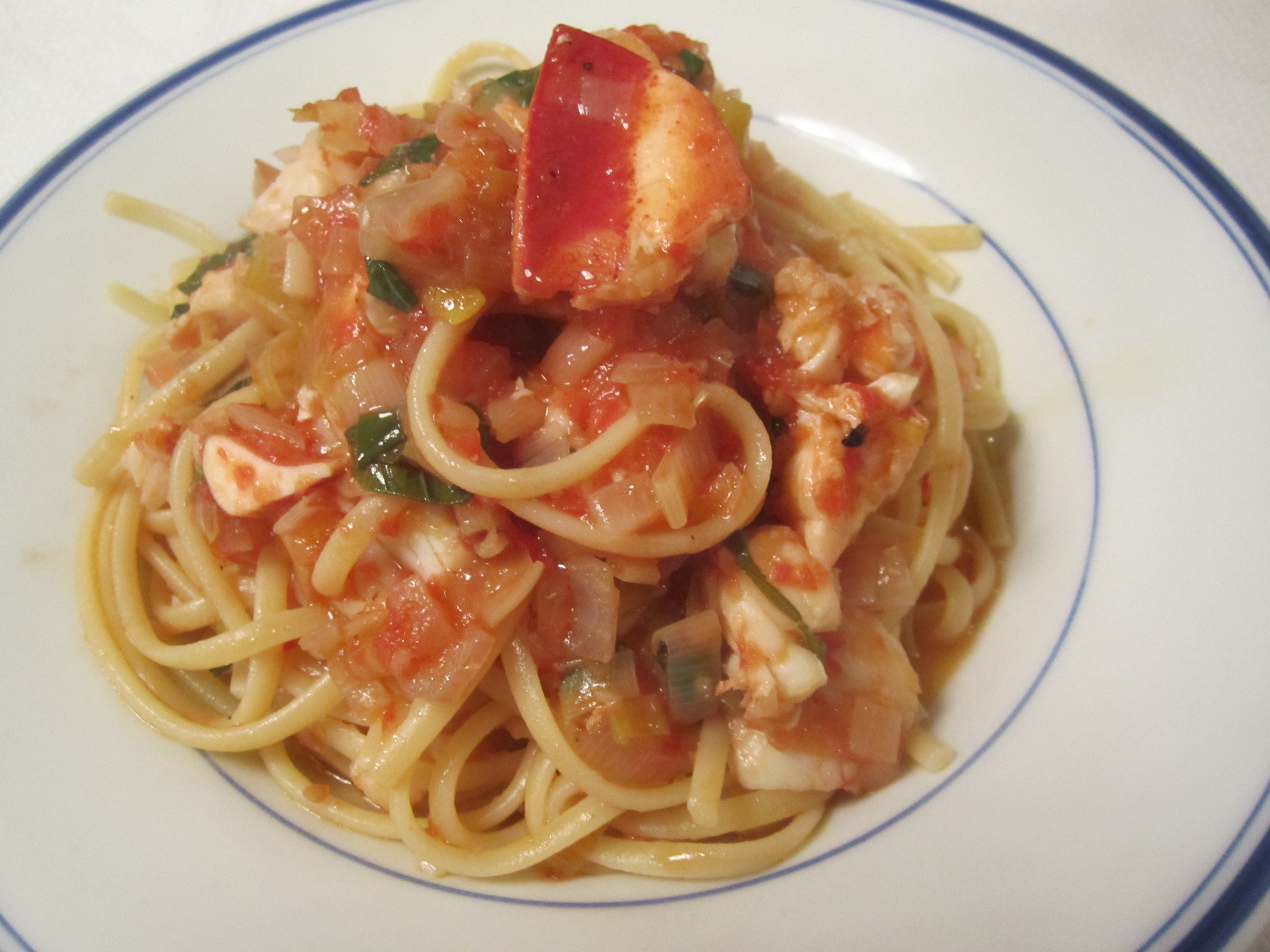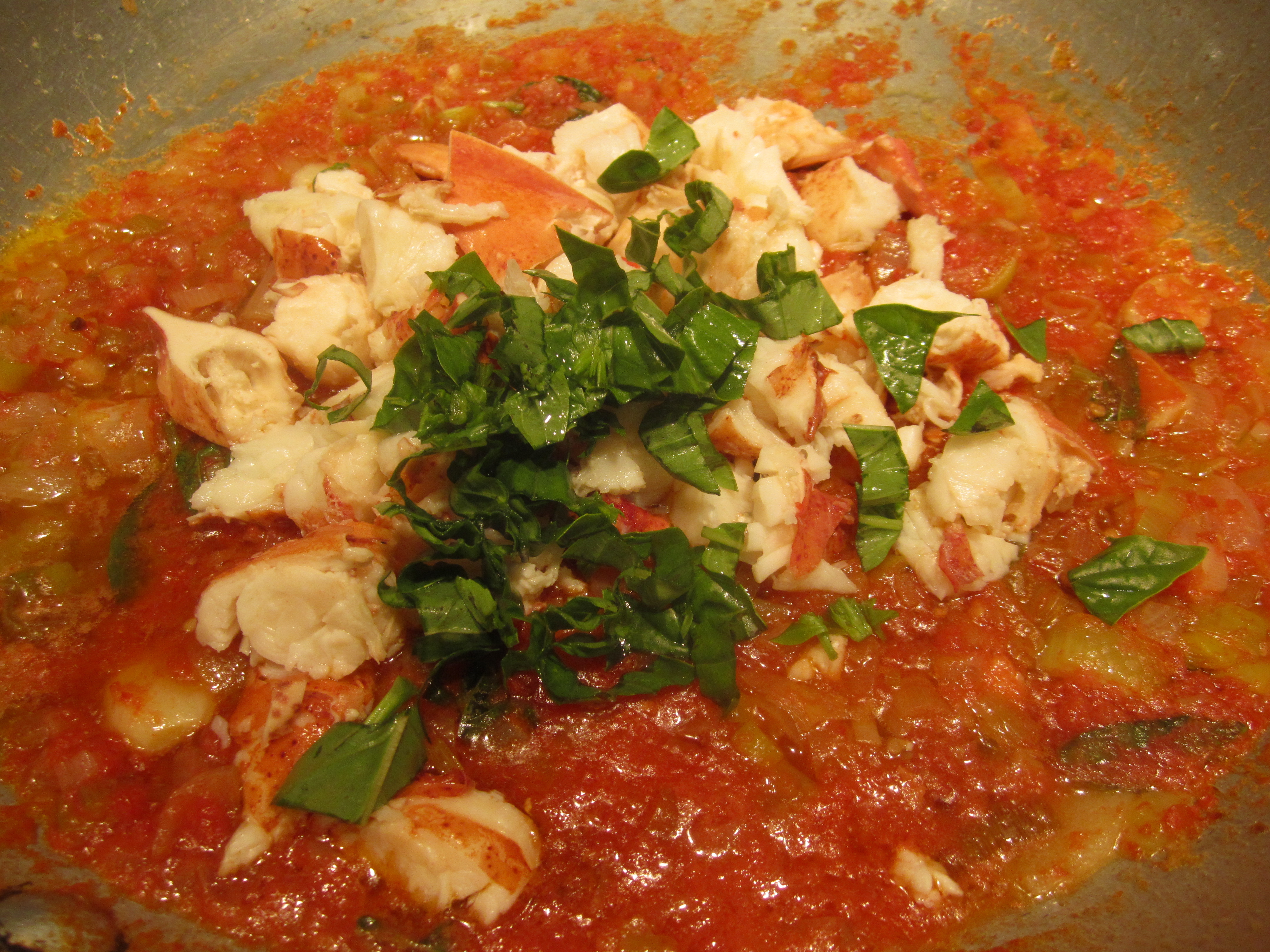Add lobster meat and allow to warm in the sauce for a minute. Right before adding the pasta to the skillet, add a handful of torn basil leaves.
