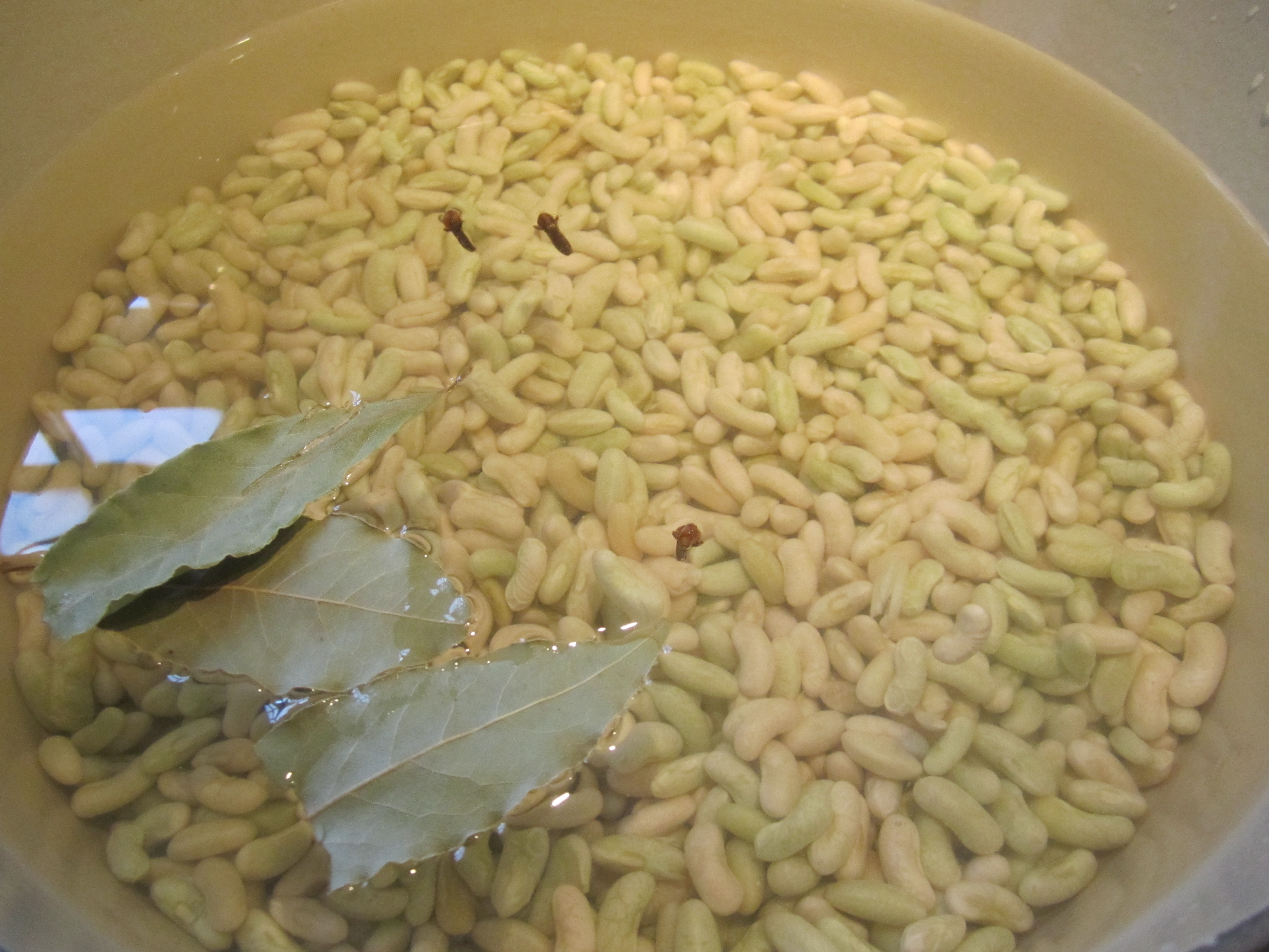 Place beans in cold water with 3 bay leaves and 3 whole cloves.