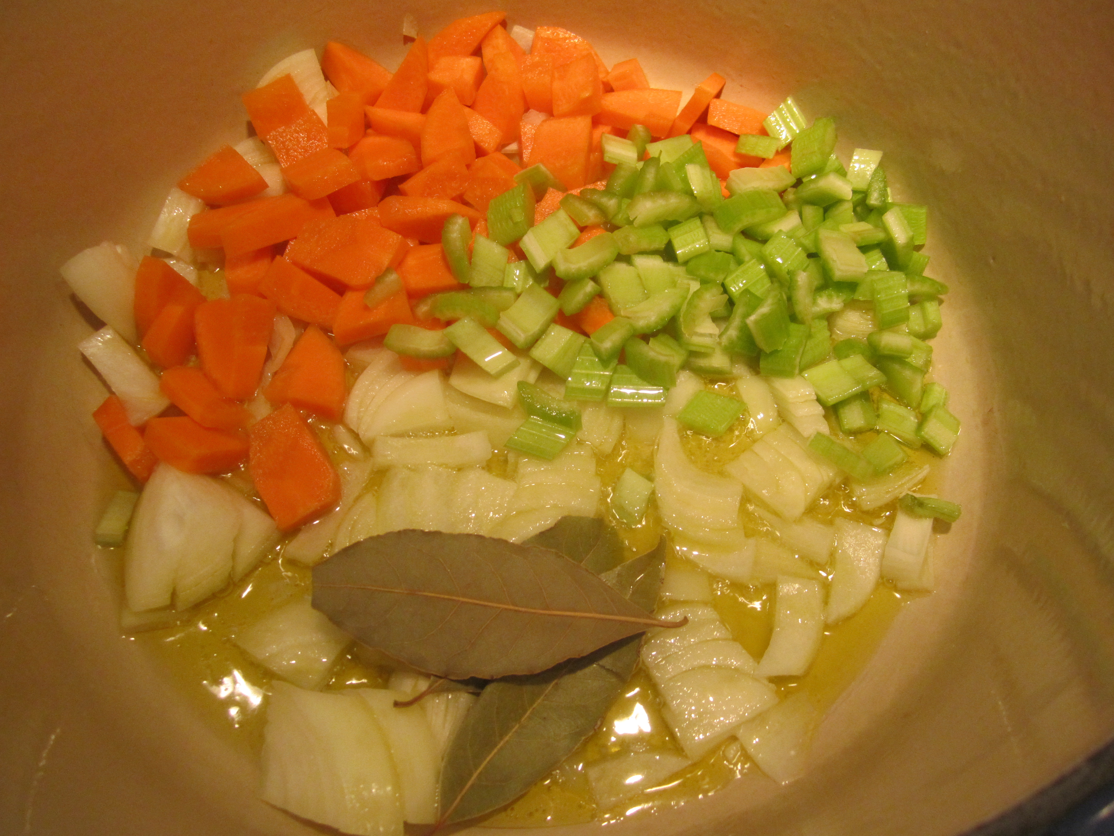 Later, I make the base for the stew, sauteing the aromatics and turkey chunks. I drain the beans, add bouillon cubes to the bean cooking liquid and add it back to the aromatics, as the base of the stew.