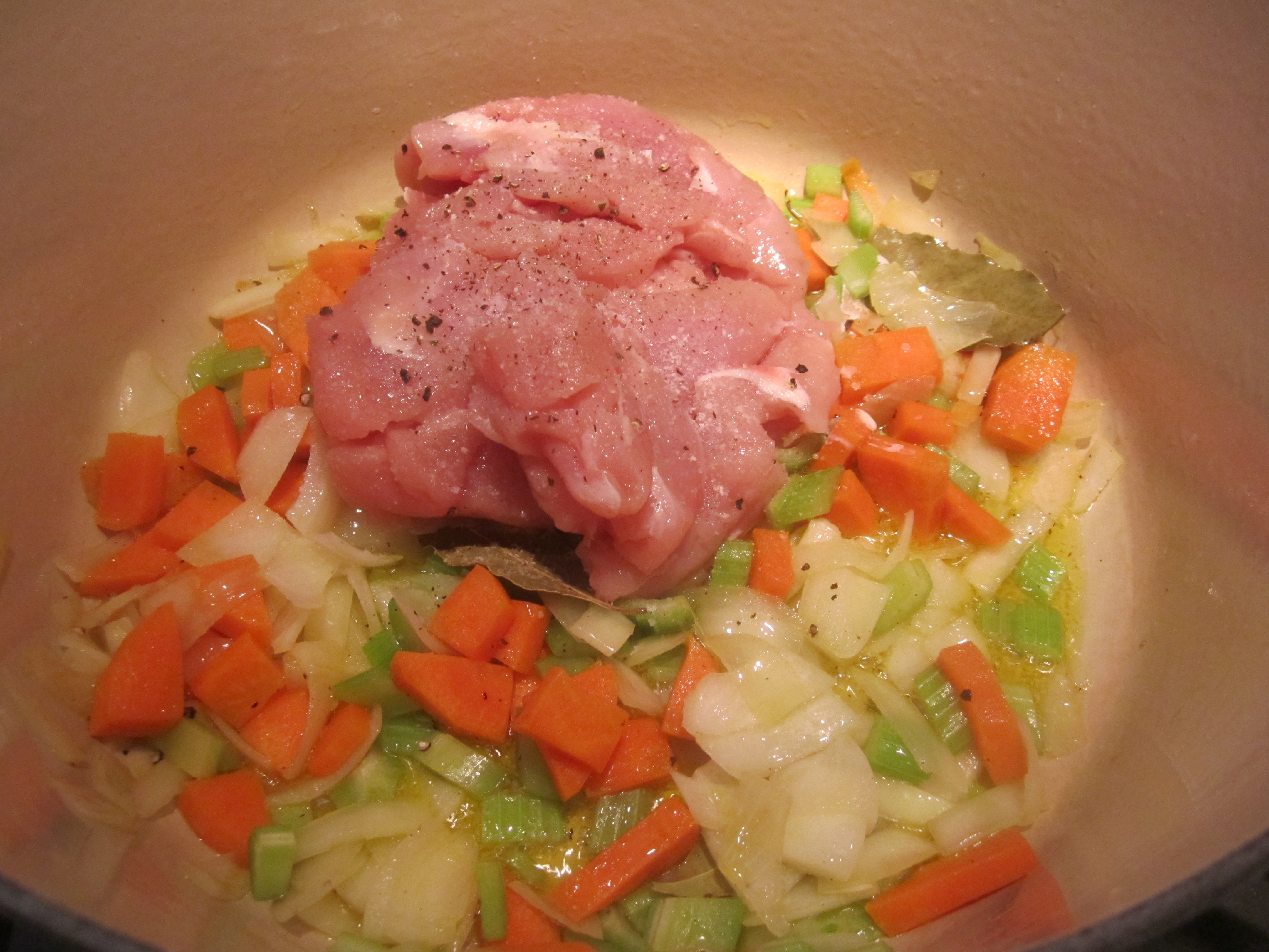 In addition, the scraps of turkey from yesterday’s turkey scaloppine that were not usable as scaloppine provided the meat for this dish.