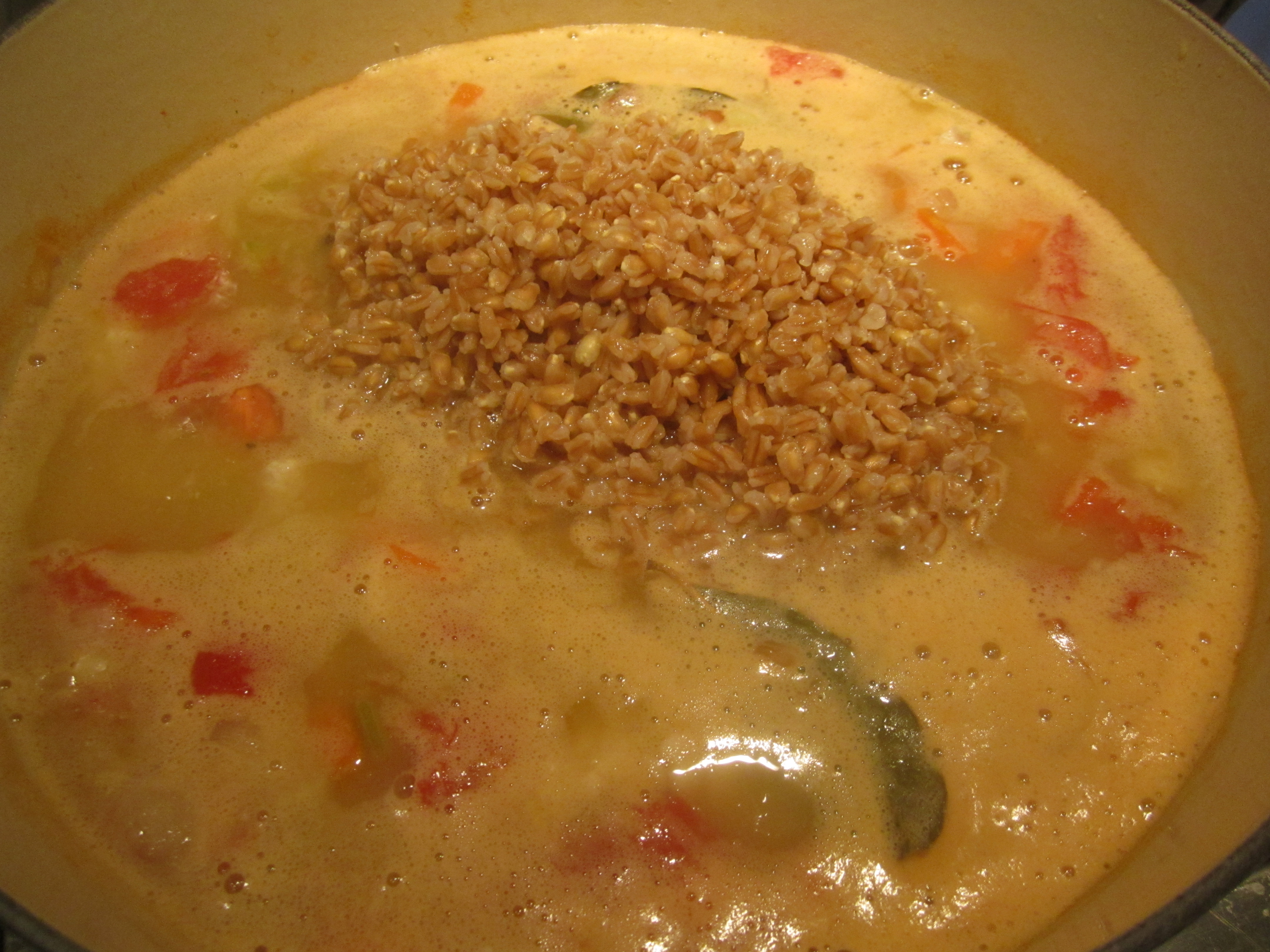1 c farro, boiled in salted water for about 30 minutes, drained, set aside, cooking liquid reserved.