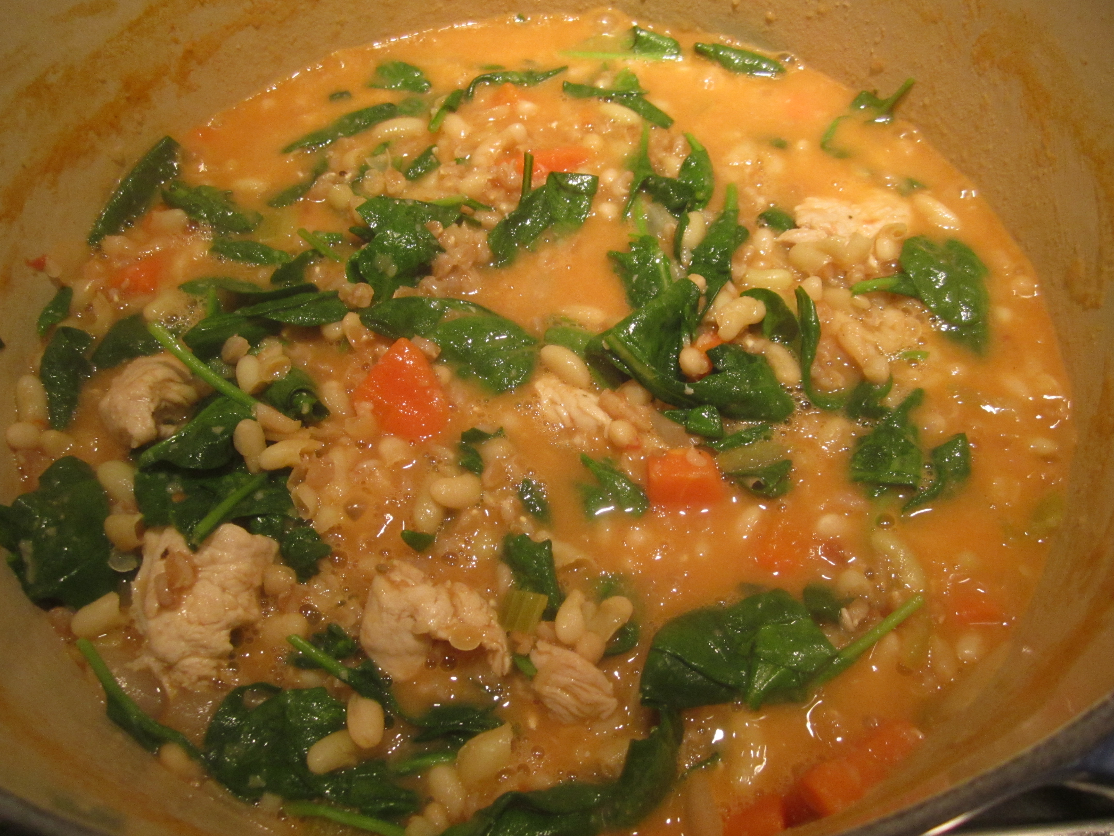 All is combined, and at the last moment, a couple handfuls of baby spinach are added to lighten the stew, and make it fit for a one-pot meal–absolutely delicious.