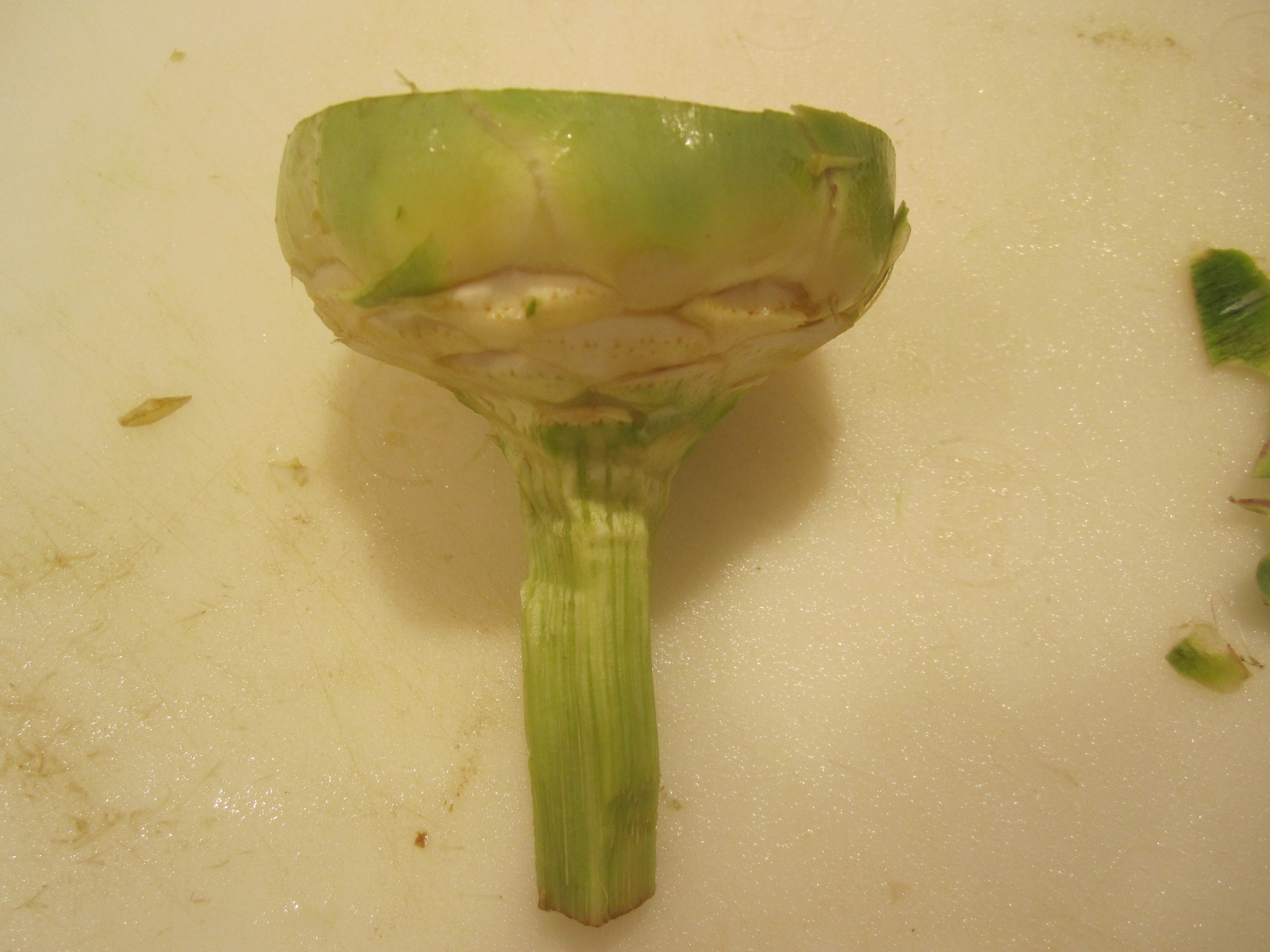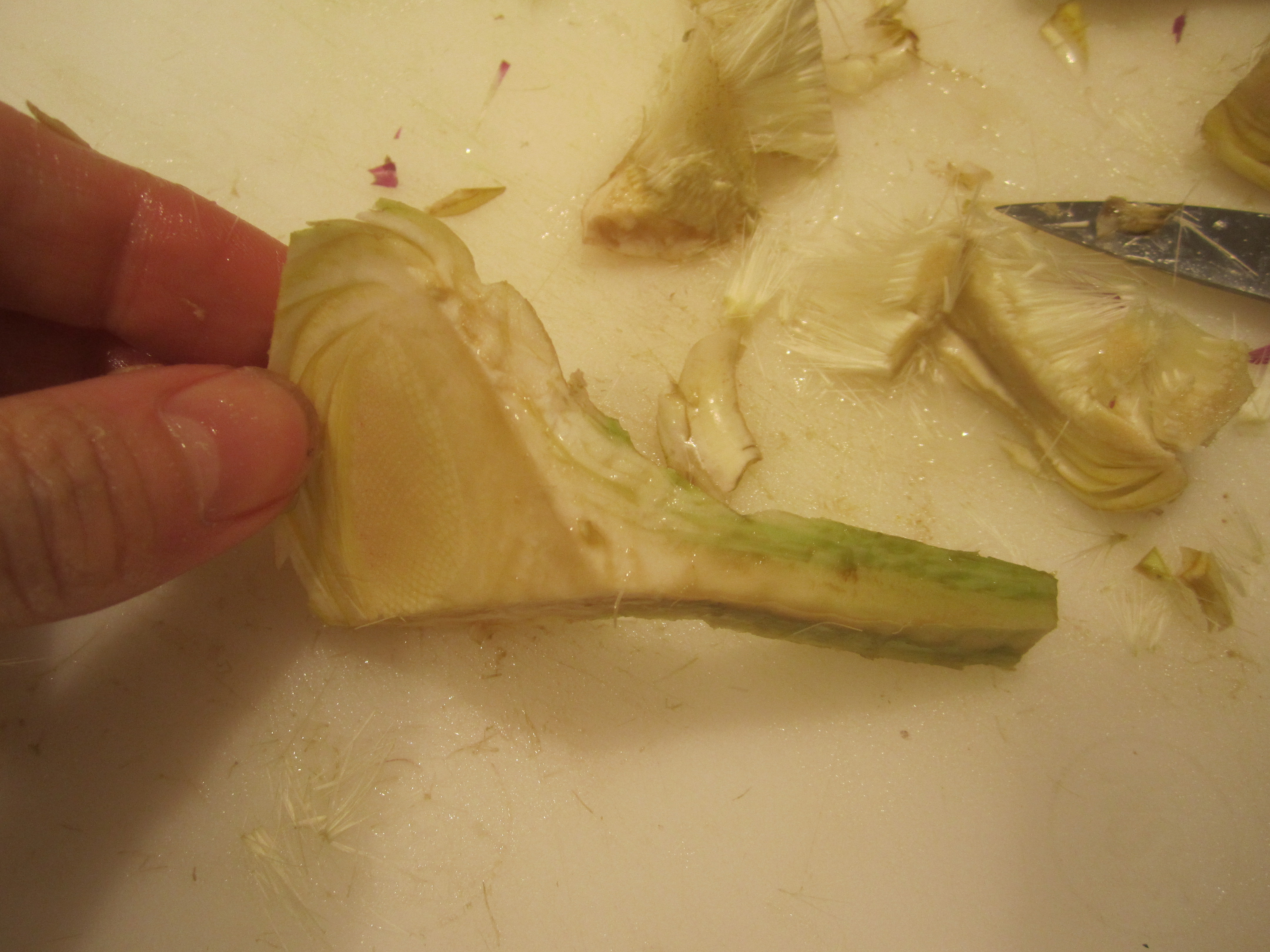 Peel off any deep green outer leaves which remain on the bottom, then with a paring knife, peel the outside of the bottom and the entire stem. You can separate the stem from the bottom, if this is easier. NOTE: If the stem is still a deep green, even after you’ve peeled it–discard–it will be too fibrous. The main way to tell if you’ve gone far enough is that the remaining parts of the artichoke should be pale green–almost white.