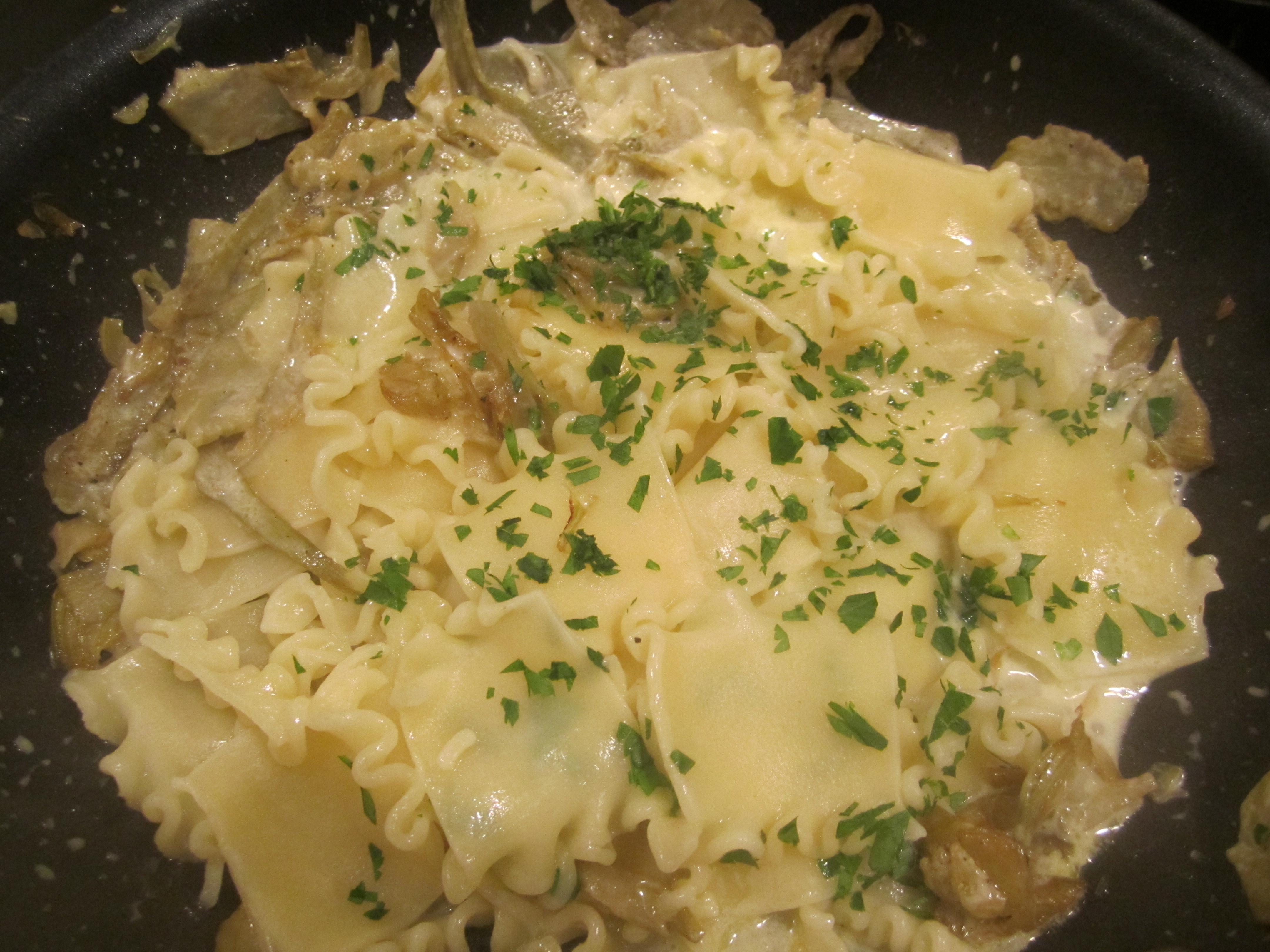 When ready to serve, cook the lasagnetti in plenty of salted boiling water until 2 minutes shy of done. Place the skillet of artichokes on high heat and add heavy cream.