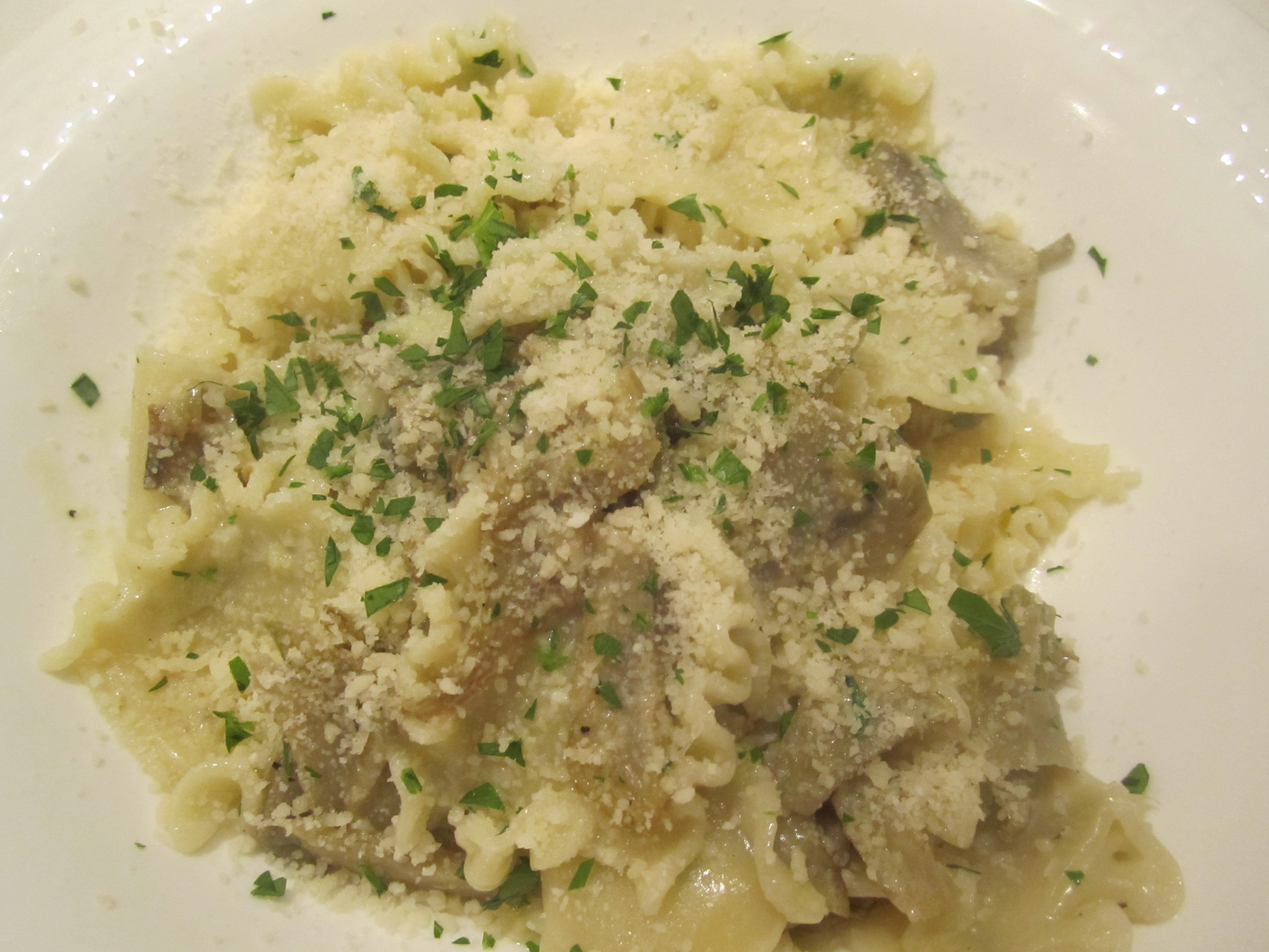 The artichokes are sautéed in olive oil and garlic, white wine is added, then the mixture is simmered for 15 – 20 minutes until tender. This step can be done ahead, then at the last minute, as the pasta is nearing completion, heavy cream is added to the artichokes, along with a generous sprinkle of parmigiano cheese.