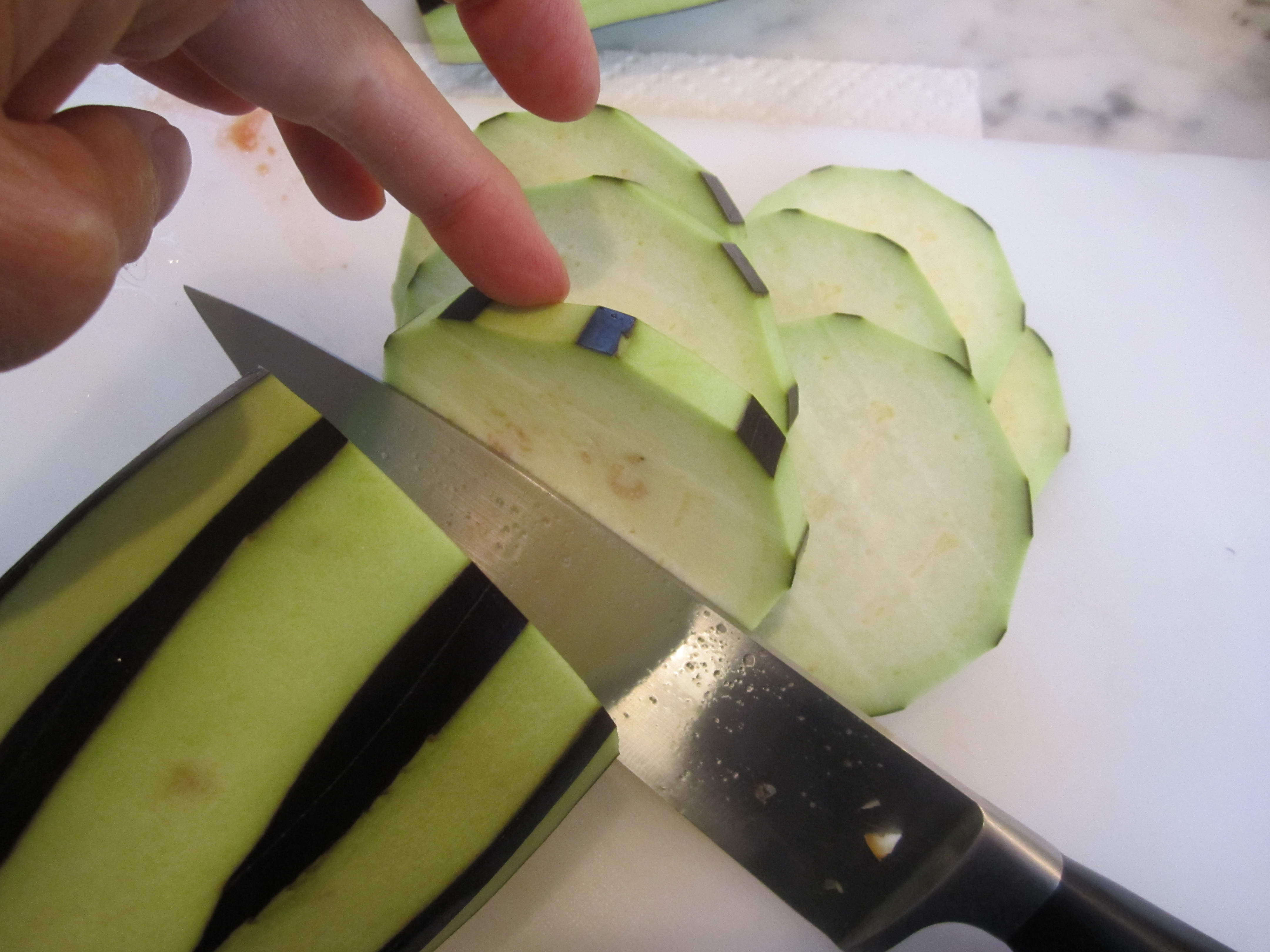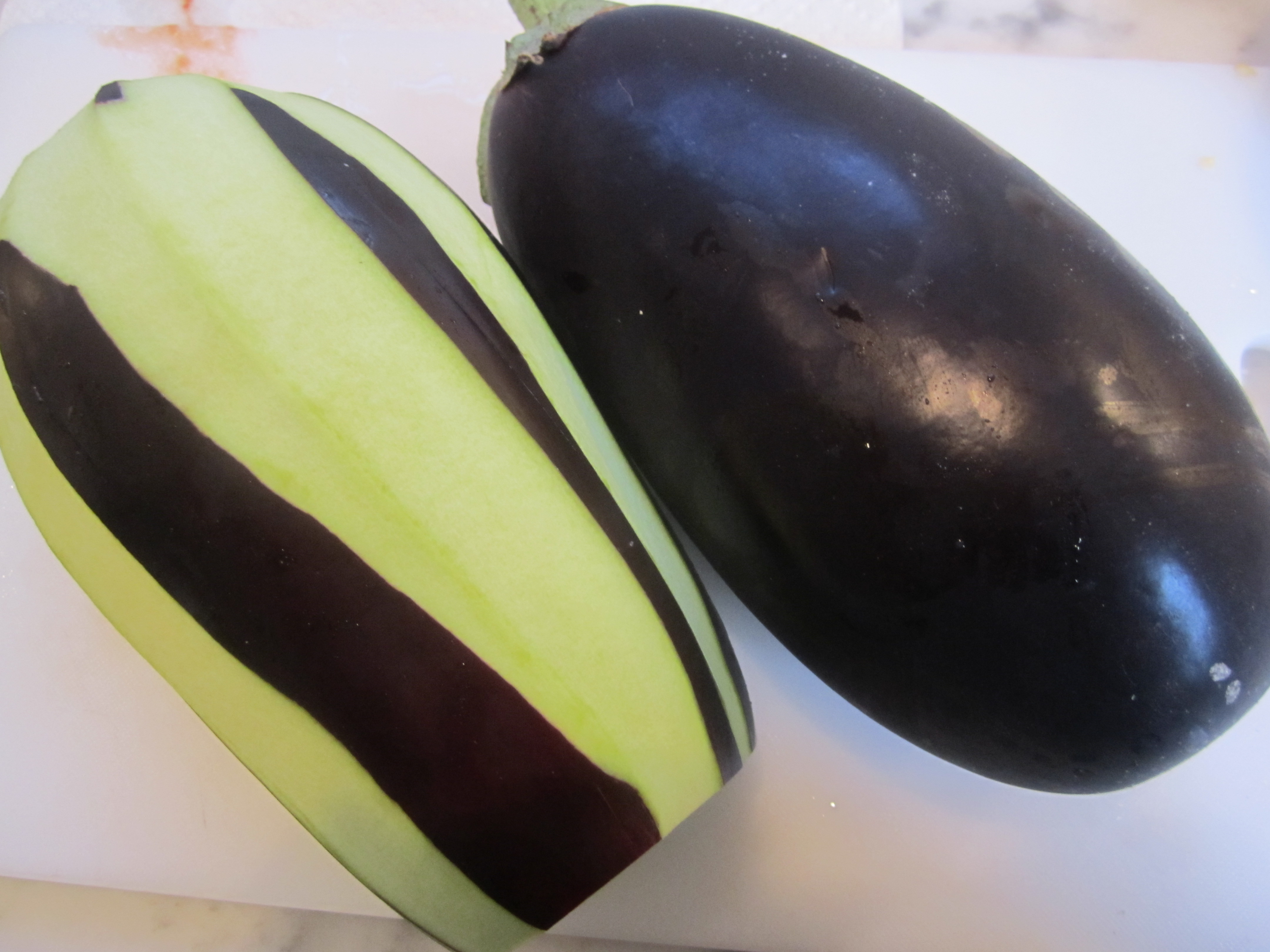 Partially peel the eggplant, leaving stripes of black peel (some peel adds flavor, but I don’t like to leave it entirely unpeeled because I feel that the peel gets too hard and leathery if left on entirely).