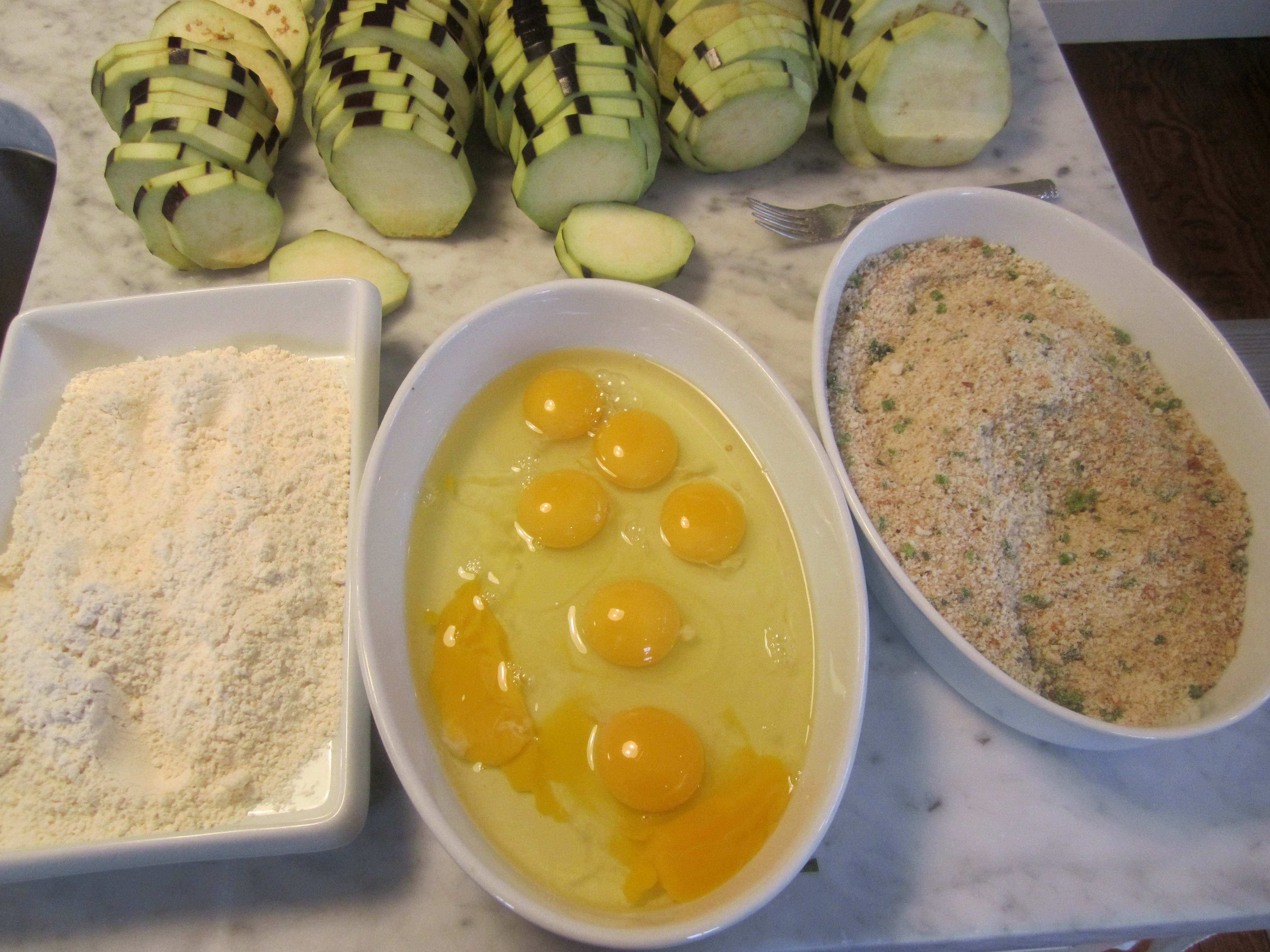 Dredge each slice first in flour, then beaten eggs, then seasoned breadcrumbs, then set aside on sheetpans that have been spread with a light coating of olive oil. Make sure to tap each slice after flouring to remove excess flour. Also, allow egg to drip off before placing in crumbs.