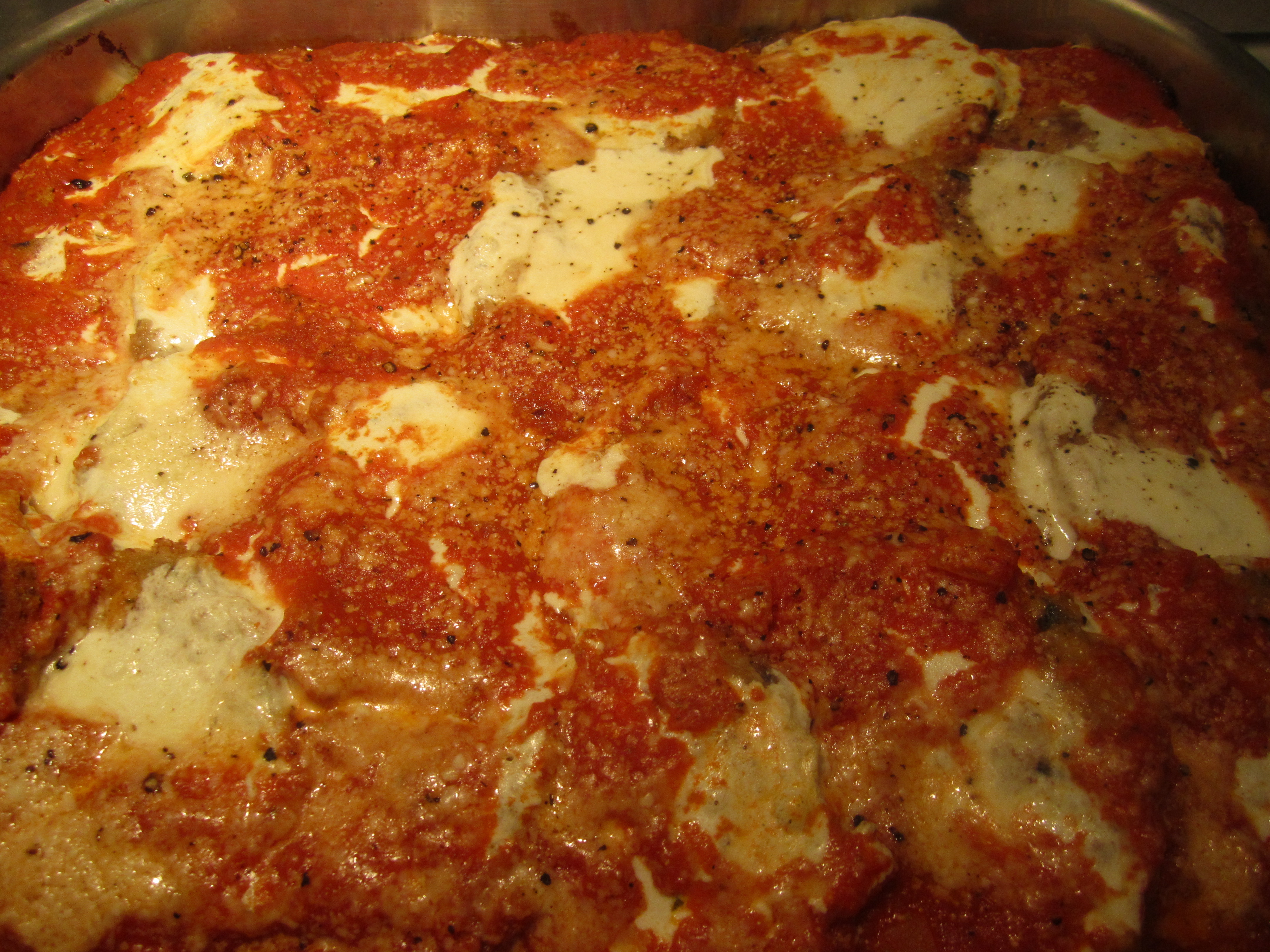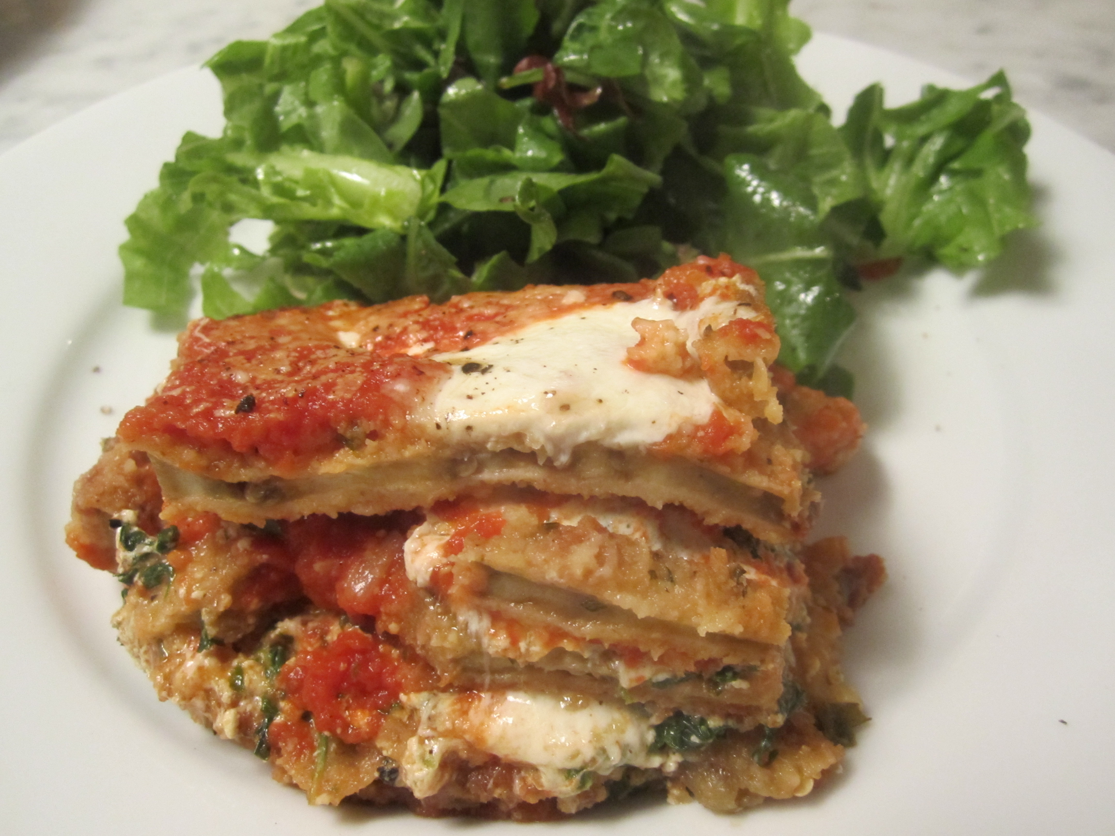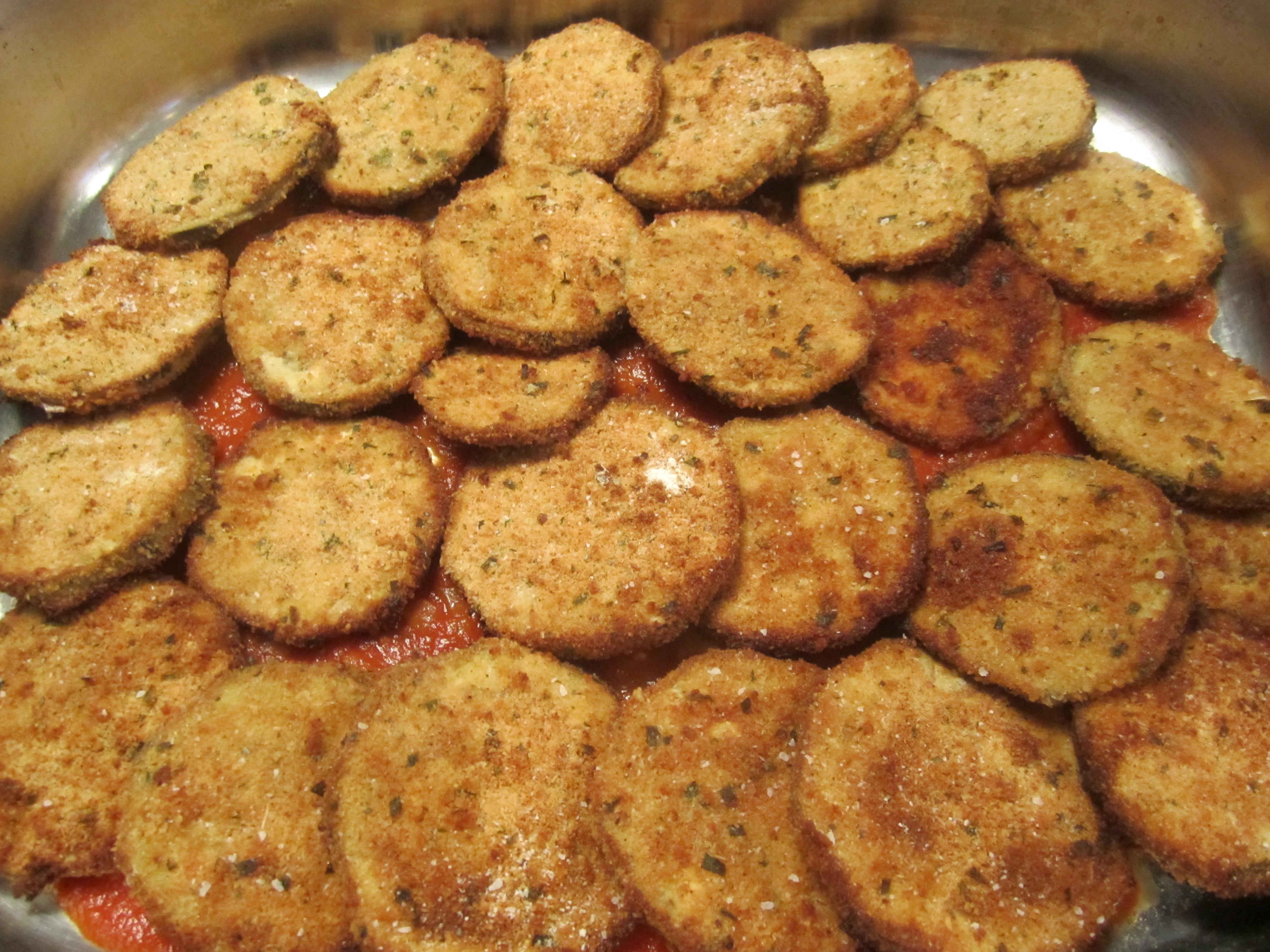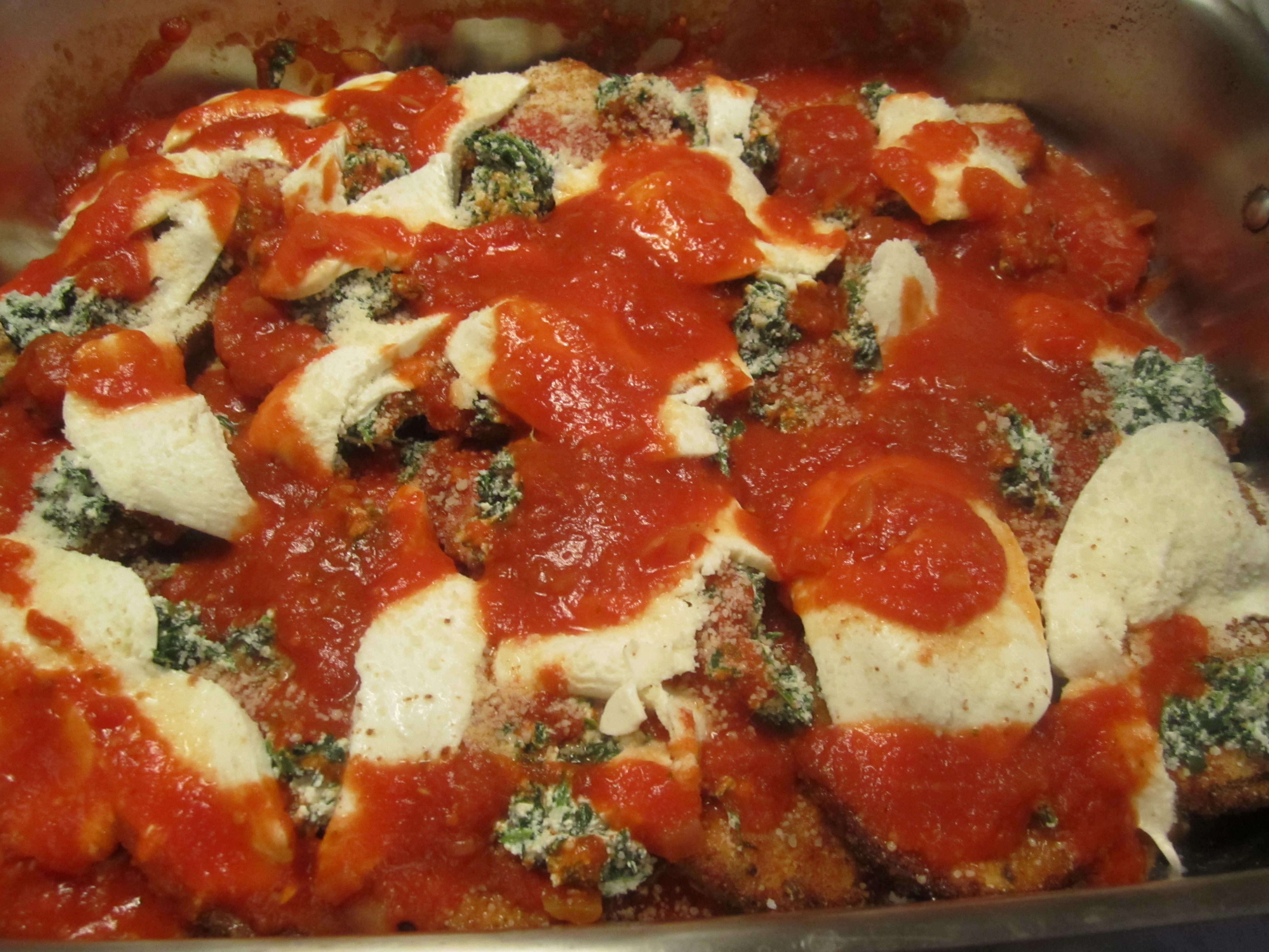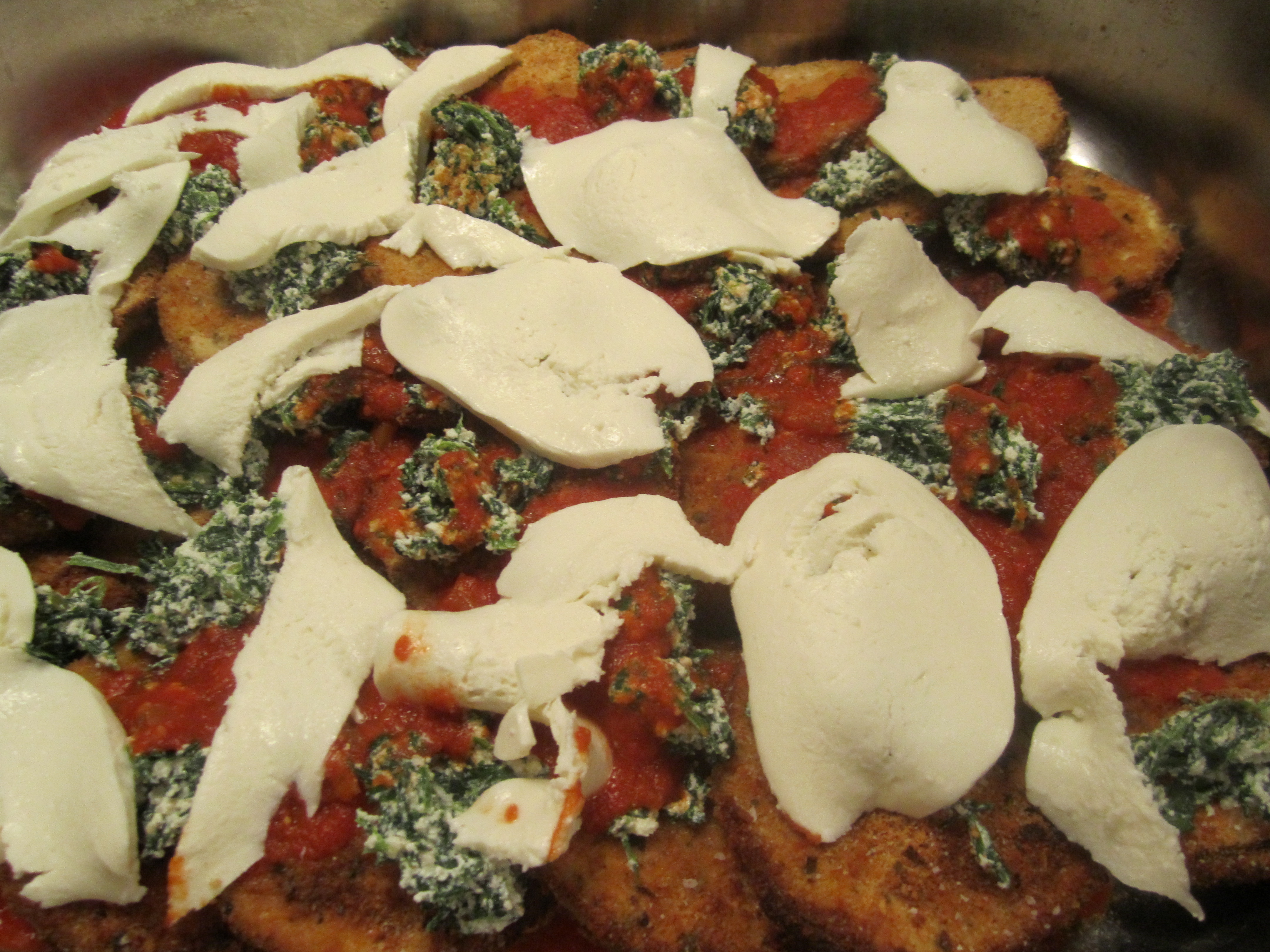 My version of it includes a layer of chopped spinach blended with ricotta. I find that in addition to the usual mozzarella and red sauce, the ricotta and spinach lighten the dish considerably, and add a green flavor to the richness of the mozzarella and breaded eggplant.