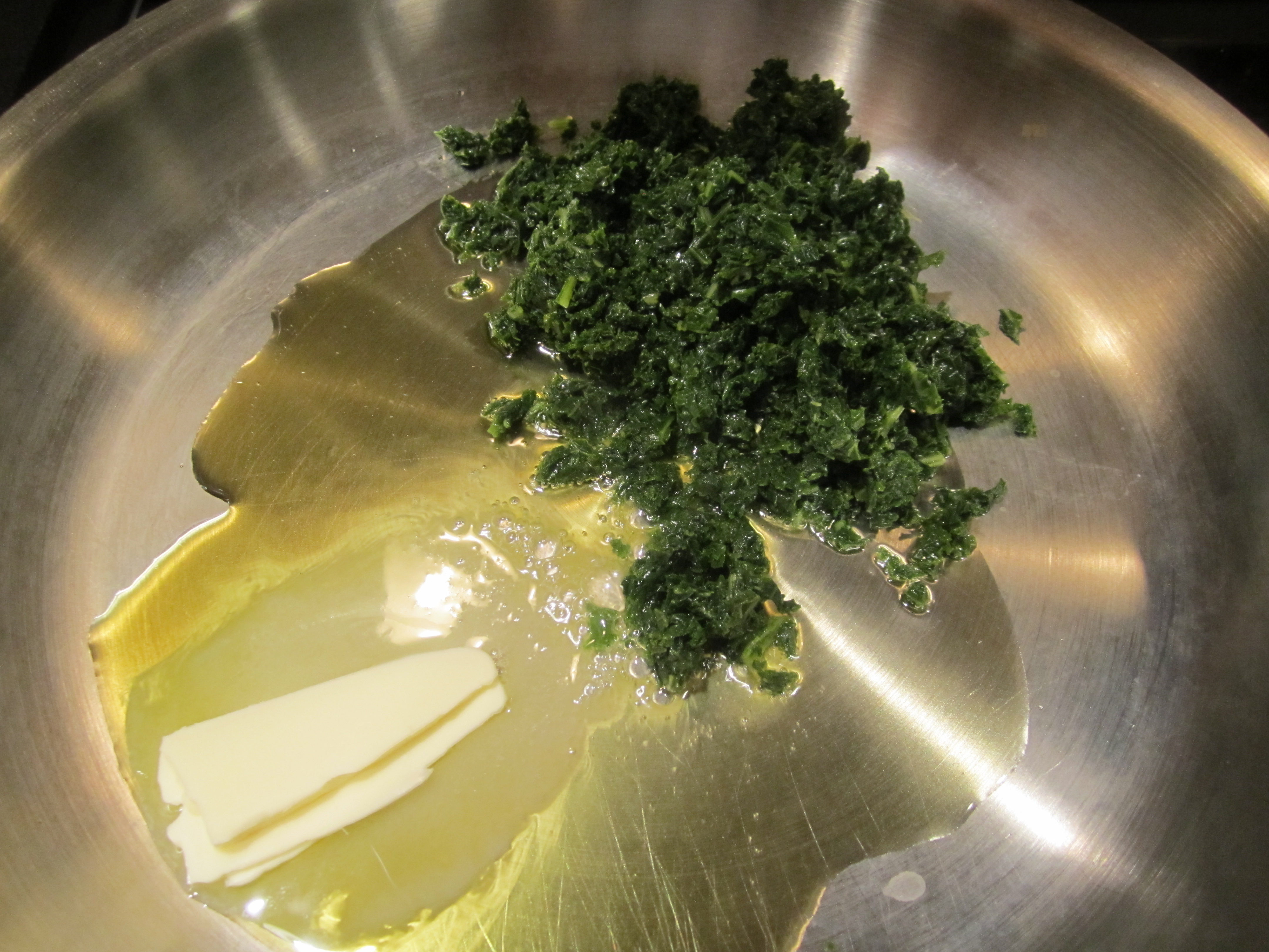 In addition, many spinach recipes direct the cook to place the raw leaves in a skillet and saute in hot oil or butter. Although this results in a nice bright green vegetable, I feel it’s better to boil the spinach first, then squeeze thoroughly in small bunches to remove the bitter iron flavor. This is admittedly much more time-consuming than simply sauteing the raw leaves, but produces a much more elegant dish.
