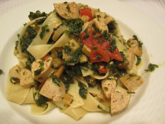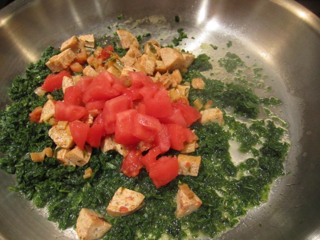 This time of year when spinach and peas are coming into season, I celebrate them in a pasta dish that’s as much vegetable as pasta. The spinach is first boiled, squeezed, chopped, then sauteed with a bit of butter and broth, then combined with pasta and blanched peas. A touch of pesto is added for herbal flavor, but not so much as to overpower the star of the dish–spinach.